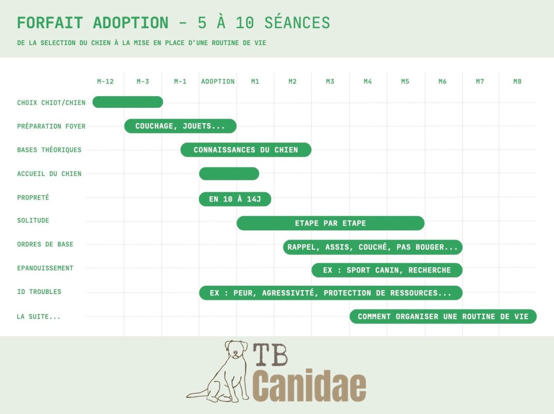 Ce forfait offre un accompagnement personnalisé pouvant débuté dès le choix du chiot. Il s'adresse également aux maîtres souhaitant adopter un chien de refuge, qu'il soit adulte ou chiot. Les différentes thématiques couvertes sont décrites dans le diagramme ci-dessous.